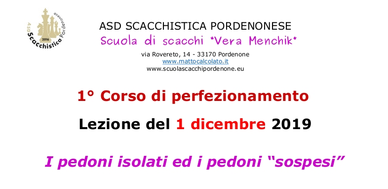 La Scuola di scacchi “Vera Menchik” propone una serie di lezioni di perfezionamento sul tema delle strutture. L’argomento trattato nel terzo appuntamento dal G.M. Kenny Solomon riguarderà i pedoni isolati e dei pedoni “sospesi” ed avrà un elevato grado di approfondimento.